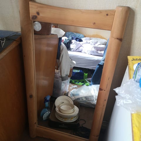Ramme og utskjæringer i mørk brunt. Passer bra i en gang, bibliotek e.l.Mål H:220cm, B:90cm, D:26 (benken under speilet).