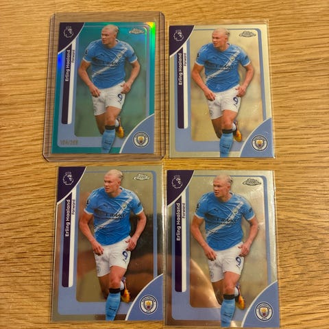 Rett fra pakkeåpning og i sleeve. Haaland Topps chrome kort.