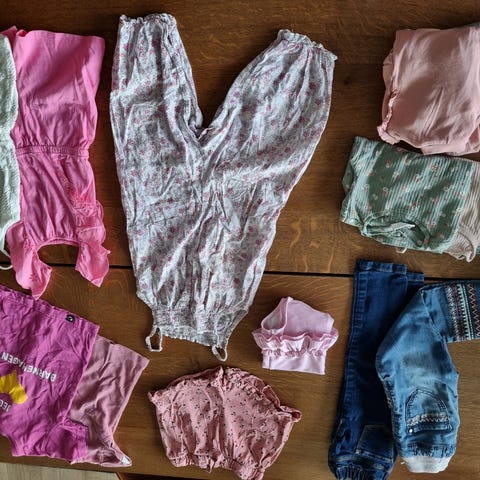 Klæspakke for jente i størrelse 92 i flerfargede varianter. Pakken inneholder flere sommerkjoler i ulike mønstre og farger, blant annet kjoler med trykk, også en t-skjorte, noen jakker, bukser og strømpebukse. Klærne passer til hverdagsbruk og barnehage, og er tilpasset barn rundt størrelse 92. Hentes i Skudeneshavn eller sendes med fiks ferdig