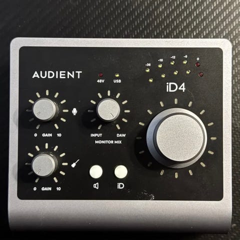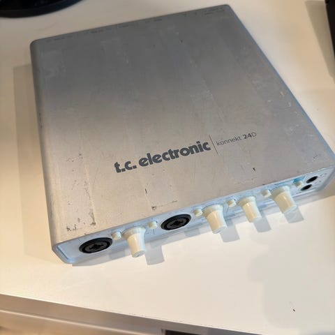 Audient iD14 lydkort. De to preampene er kjent for å vær bra! Her kan du koble til et annet lydkort og få 14 inputs.Strømforsyning følger med.