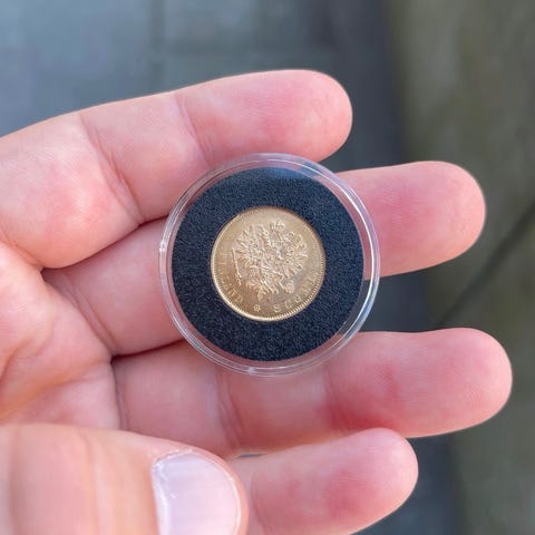 Mynten veier 3,22 gram 900 gull (= 2,9 gram 999 gull).