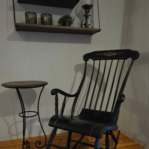 Gammel og godt brukt gyngestol. Merket av tidens tann. Forsterket med beslag flere steder. Meiene er litt avrettet så den gynger litt hakkete, men fin å sitte i. Vet ikke alder på den. Sjarmerende stil over stolen.