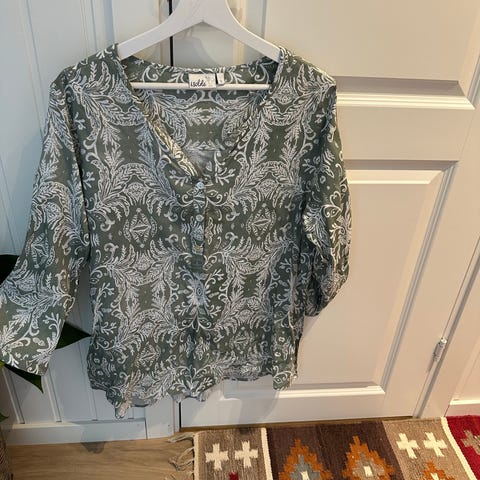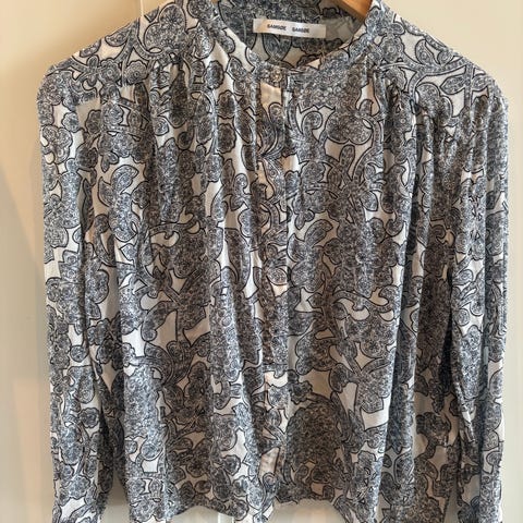 Soaked in Luxury bluse for dame i størrelse M. Blusen er grønn med hvitt mønster og er laget av bomull. Den har rund hals med lett rysjekant og knappelukking foran ved halsen. Ermene er lange med lett puff og strikk nederst. Passer til hverdagsbruk og kan kombineres med både bukser og skjørt.