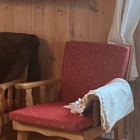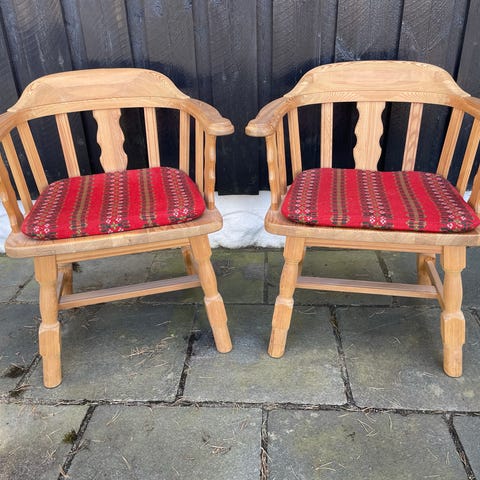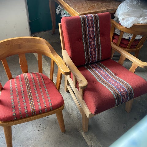 VI har 3 stk av disse stolene. Sittehøyde er 42 cm. Høyde på rygg er 74cm Gis bort ved rask henting. 2stk med puter.