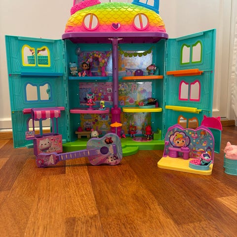 Et stort lekehus med mange morsomme lyd- og lyseffekter. Kul interaktiv leke for familiens yngste. Den har mange knapper som vekker nysgjerrigheten: løft på toalettlokket så spyler toalettet, drei på sommerfuglen så kjører bilen rundt treet, tenn lamper, ring på døren, lytt til snorkelyden, hundeglam, melodier og mye mer.