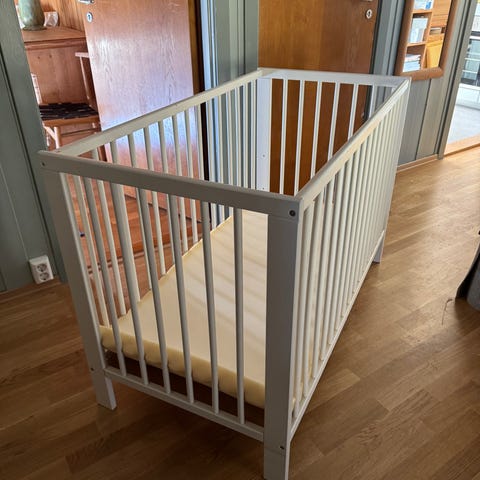 Sengen leveresmed Yngri madrass (Himmel) som er brukt av ett barn. Beskyttelsestrekk har blitt benyttet hele tiden.
