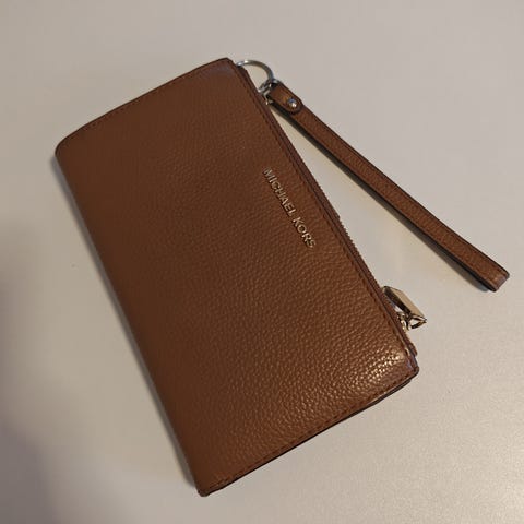 Michael Kors Whiskey Brown Croc Leather Wristlet. Denne lommeboken er laget av preget skinn med krokodillemønster og har en praktisk håndleddsstropp