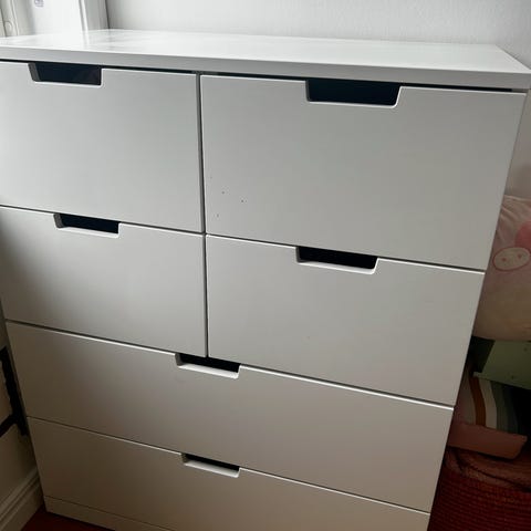 Hvit Nordli kommode fra IKEA med seks skuffer selges. Noen små bruksmerker (se bilder), ellers i veldig fin stand.