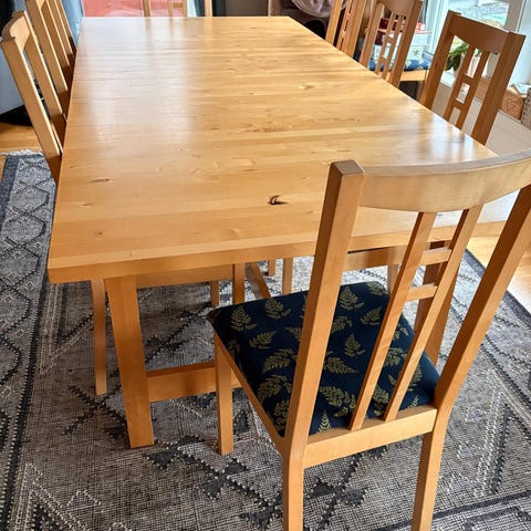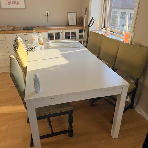 Hvitt spisebord med svarte stoler gies bort. To av stolene er identisk, mens den tredje er høyere. Mål bord: 75x75cm, høyde 74 cm. Alt er pent brukt.