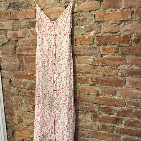 Rød kjole med blomster i størrelse small med splitt på siden.