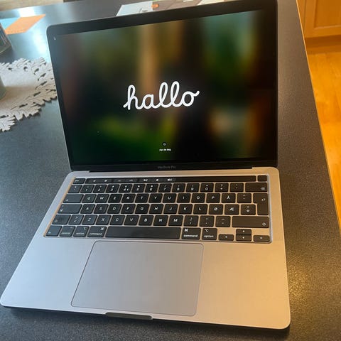 Selger en meget pent og lite brukt Apple MacBook Pro 13 tommer i sølvfarge. Kjøpt juni 2021 og brukt i underkant av et år, har ligget i en skuff siden. Alt fungerer som det skal og batteriet er i orden. En liten flekk på undersiden (se bilde) er det jeg kan finne av bruksmerker.