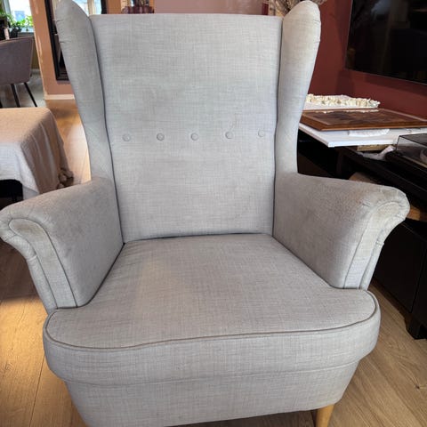 Lys blå/brun lenestol med fotskammel gies bort. Godt brukt.
