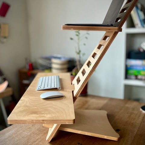 Stativet er laget i bøyd bambus med lys trestruktur. Det har en enkel kant i front som holder nettbrett eller bok på plass.