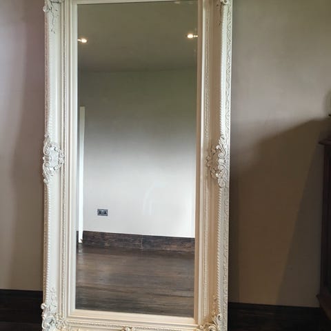 Vintage speil med dekorativ ramme. Rektangulært speil med bred, profilert ramme med utskårne detaljer. Rammen har en lys, nøytral fargetone som passer inn i ulike interiør stiler. Speilet kan brukes i stue, gang, soverom eller andre rom der det er behov for et større vegg speil. Målene er 77,5x 107,5 cm