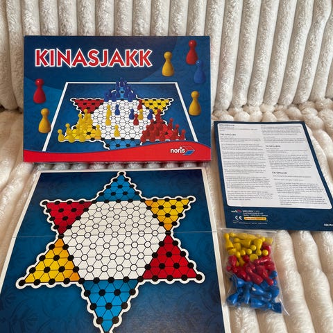 Alga Kinasjakk brettspill. Klassisk kinasjakk med seks fargede spilleområder formet som en stjerne. Spillet består av spillebrett med dragemotiv, løse plastbrikker i flere farger og separate brikkeholdere. Egnet for flere spillere samtidig. Regler følger med i esken.