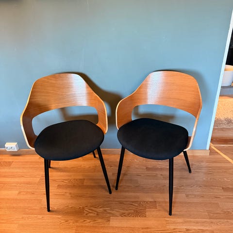Selger to spisestoler i naturlig eik med svart sete fra Jysk. De er svært pent brukt og fremstår som nye.
