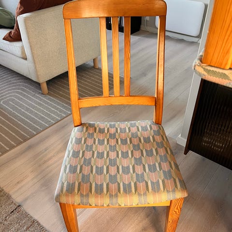 Pene stoler, som lett kan bli veldig kule med nye trekk og en lett puss. To av stolene har originalt rutete trekk, mens fem har «nytt» trekk, trolig fra 90-tallet engang.