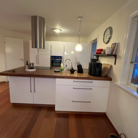 Selger et klassisk kjøkken med hvitevarer (ventilator, intergrert kjøleskap, platetopp, ovn og mikro). Kjøkkenet har fint svart benkeplate med en kvalitet stein. Her får du gode hvitevarer for prisen.