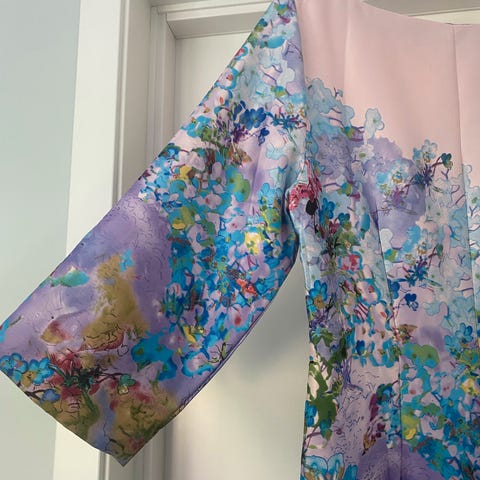 Nydelig,lang kjole fra India, typ Ibizakjole i str.M/L,lite brukt. Kjolen har regulerbare stropper og vaffelsøm bak på ryggen, knytebånd foran. Laget av 70% silke og 30% viskose. Kan sende🌿