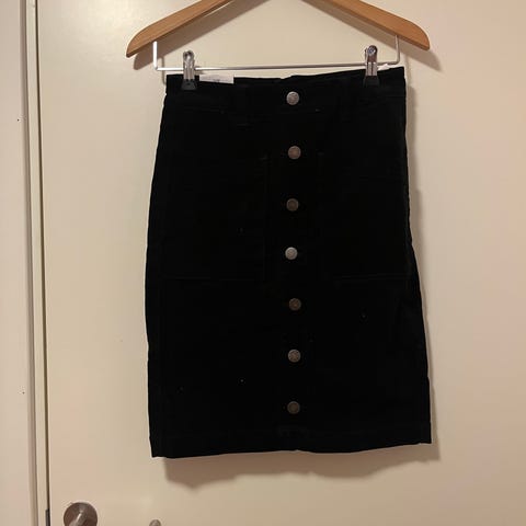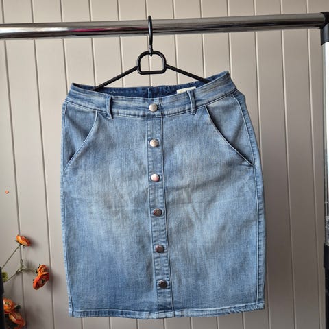 Floyd skjørt for dame i størrelse S. Skjørtet er blått og laget av bomull. Det har knapper langs hele fronten og store lommer foran. Baksiden er enkel med søm midt bak. Passer til hverdagsbruk og kan kombineres med ulike topper og jakker.