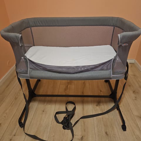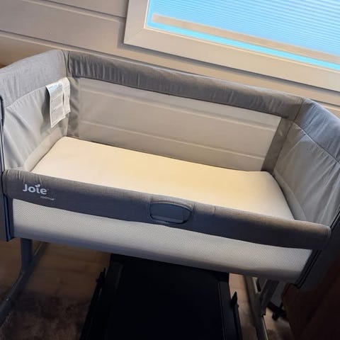 Ubrukt bedside crib fra JLY med ubrukt Babydan madrass. Med hjul og justerbar høyde. Har fått noen skader under lagring (se bilder)