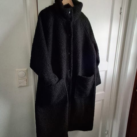 Alexandra Ritzi kåpe for dame i størrelse L. Kåpen er svart og laget i polyester. Den har hette med pelskant og pelsdetaljer foran og på ermene. Lukkes med hemper foran og har beltedetaljer bak i livet. Egner seg som yttertøy på kjølige dager.