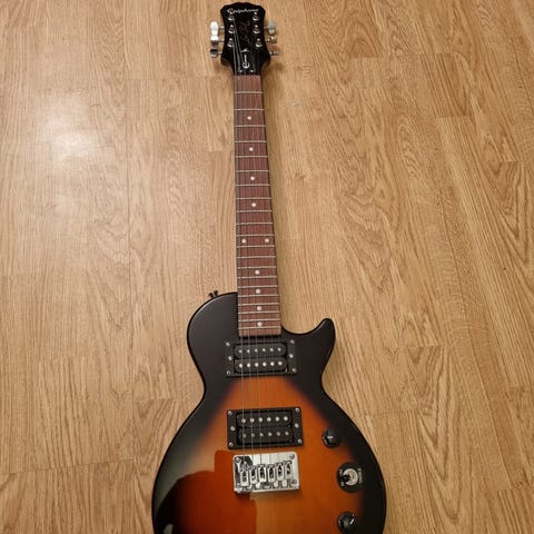 Epiphone Les Paul Special II elektrisk gitar i svart finish. Modellen har solid kropp med Les Paul-form, bolt-on hals og gripebrett med dot-inlays. Utstyrt med to humbucker-pickuper, 3-veis pickupvelger, volum- og tonekontroller samt fast stol/bru. Stemmeskruer i metall på hodet og halsplate merket Epiphone på baksiden. Det er synlig lakkavskalling/skade ved reimfestet på kroppen. Egner seg som elektrisk gitar til øving og spilling i ulike sjangre.