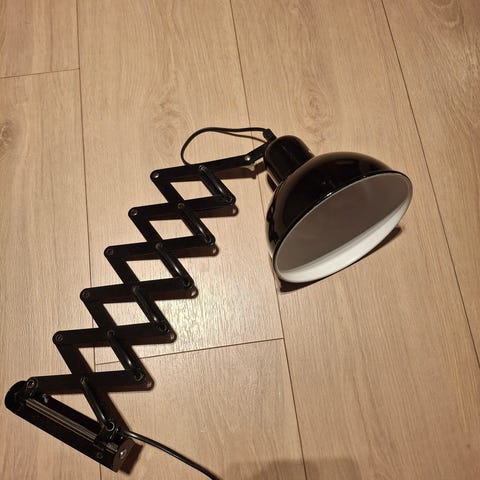 Uttrekkbar lampe ca 40-150 cm. Metall. Tung massiv fot av jern. Kan også brukes som bordlampe og vegglampe. Har aldri vært brukt, men har noen små riper etter flytting.