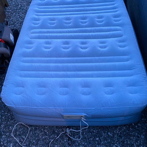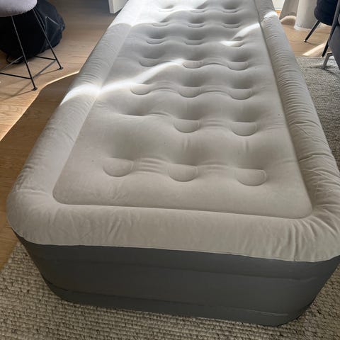 Oppblåsbar madrass med innebygd pumpe selges.