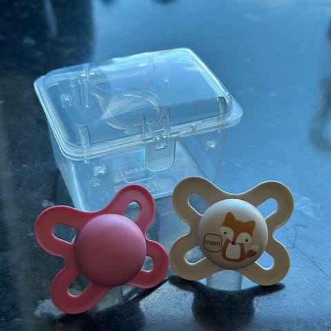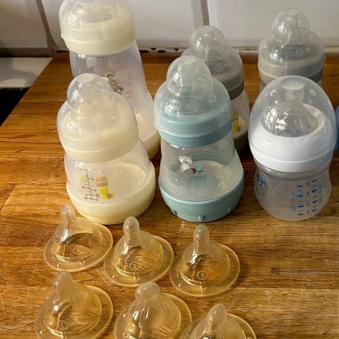 Gir bort 4 MAM flasker og en fruktsmokk. De er godt brukt og blitt misfarget, men funker fortsatt bra. De er vasket i oppvaskmaskin. Smokkene til flaskene er str 2