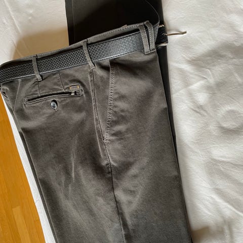 Meget pen og god stretch herrebukse fra Meyer med beltereim som hører til. Rette bein.