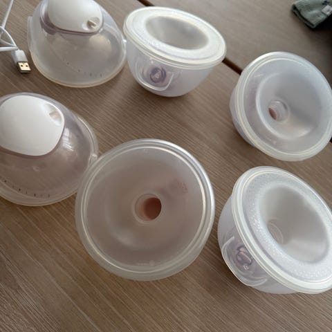 Jeg har kastet flasken som fulgte med, men kan legge ved en oppbevaringsbeholder med lokk og adapter som kan brukes til pumpen. (Se siste bilde) Forøvrig passer pumpen på vanlige avent flasker.