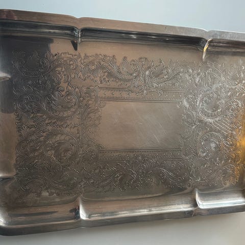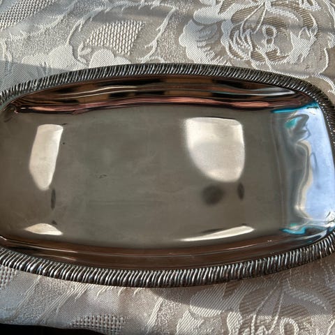 Søkeord: sølvplett, sølvfat, silver, 1980’s, leonard silver, tarnished, poleres, vakkert, elegant, fat, servering, vintage, skatt.