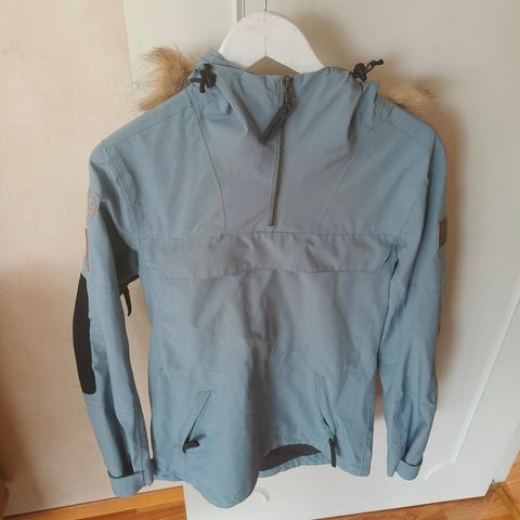 selger anorak til dame, størrelse 38,"M", mørk blå farge. Veldig bra til turer våren eller høsten, vann avisende, beskytter mot vind, har side lommer og armen lomme