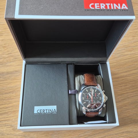 Selger en Certina klokke i normal stand. Se bildene for å vurdere tilstanden. Klokken har safirglass. Det er ingen riper i selve glasset, men det finnes noen små bruksmerker i det oleofobiske belegget på overflaten. Dette er ikke riper i glasset.
