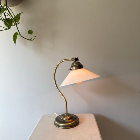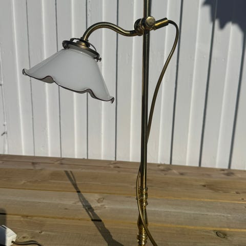 Lampen er i vintage stand. Messingen har noe bruksmerker og flekker. Foten har også et par sprekker og en liten bøy. Men dette regnes som sjarmerende etter alder. Se alle bilder for stand og kjøp deretter.