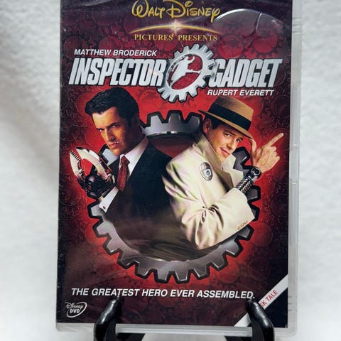 Disney Inspector Gadget DVD med filmversjonen av Inspector Gadget. Omslaget viser hovedfigurene og tannhjulmotiv i bakgrunnen. Formatet er DVD, egnet for standard DVD-spillere som støtter regionen utgaven tilhører. Passer for samlere av Disney-filmer og de som ønsker å se spillefilmen basert på Inspector Gadget-universet.