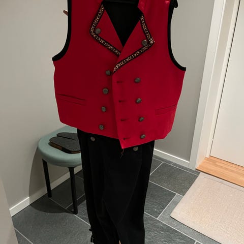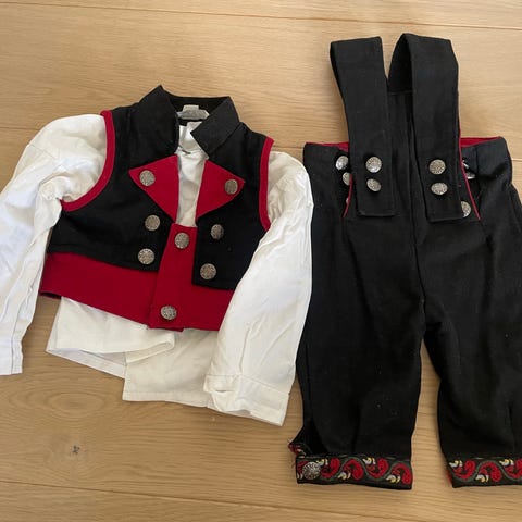 Inneholder vest, skjorte og jakke. Jakken er i størrelse 134, skjorte og vest i 128 (men brukt samtidig). Hvit skjorte, svart bunadsjakke og svart/rød vest.