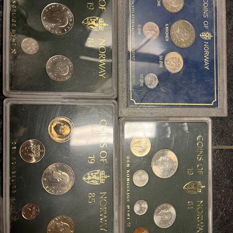 Norges Bank Proof Coins of Norway myntsett årgangene 1994, 95, 97, 98 2002 og 2003. Settene inneholder norske mynter presentert i plastkassetter med blå bakgrunn og påskriften «Proof Coins of Norway». Egner seg som samlerobjekt for moderne norske mynter i proof-kvalitet. Pris er per stk.