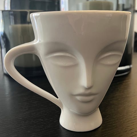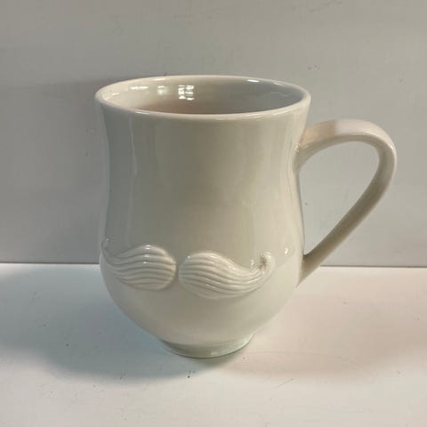 Selger to kopper fra Jonathan Adler krus i hvitt porselen. Kruset har formet ansiktsmotiv med lepper og bart i relieff på utsiden. Egnet til varme og kalde drikker. Leveres som sett med to krus slik som på bildene.
