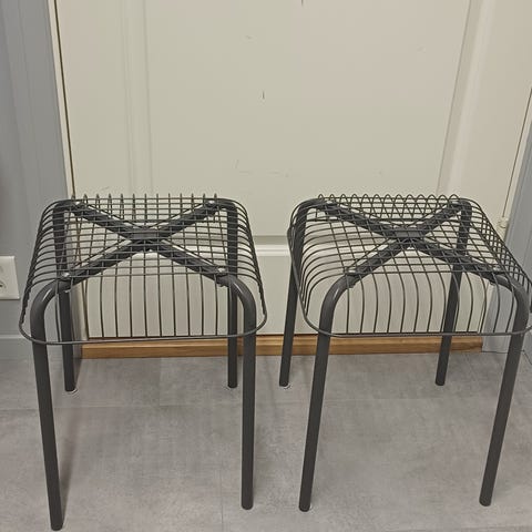 To stk bord selges samlet. Vært brukt som nattbord. Understell i blankt metall og toppen er en tresort med struktur og «liv» i.
