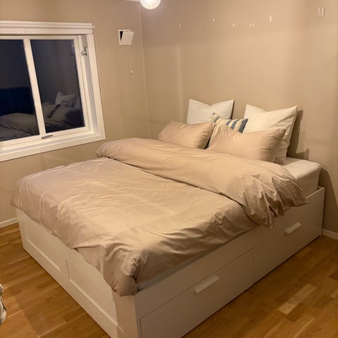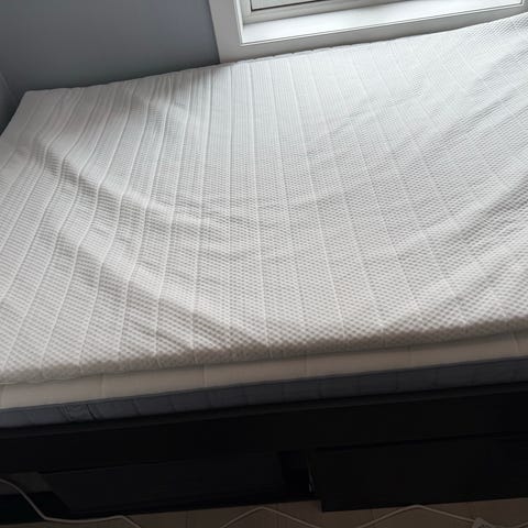 IKEA fjell seng 160x200 i hvit. Rammekonstruksjon og hodegavl i tre med paneldesign. Sengen har integrerte skuffer på sidene med masse oppbevaringsplass. Følger med Hyllestad madrass av fast type fra IKEA. Kan få med overmadrassen om ønskelig, men den er det nok på tide å bytte ut. En veldig praktisk og fin seng med skikkelig god madrass som har vært en drøm å sove på! Selges grunnet flytting. Hentes i 2. etasje på Bjølsen. Jeg kan demontere den på forhånd eller demonter selv hvis man vil se hvordan den skal settes sammen igjen.