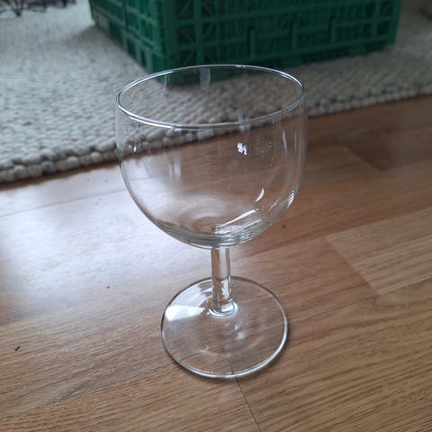 Likørglass på stett i klart glass med slipt mønster. Glassene har rund klokkeform og dekor med stjernemønster. Egner seg til servering av likør, dessertvin eller andre små drikker. Leveres som sett med flere like glass, som vist på bildene.