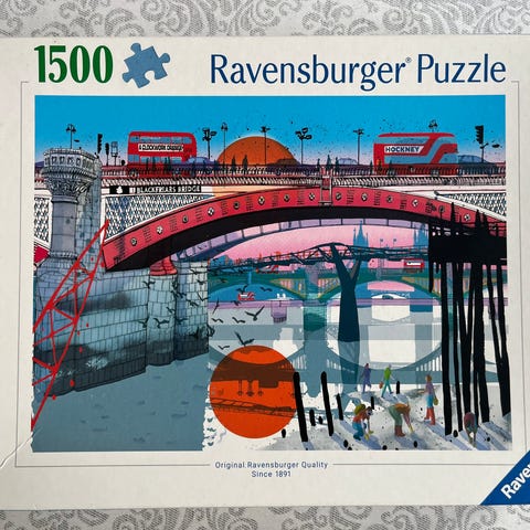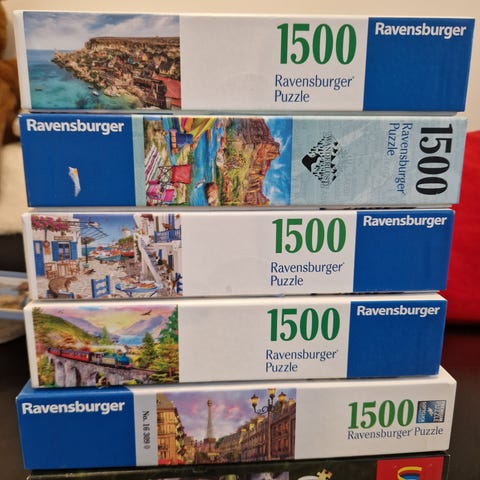 Pakke med puslespill fra Ravensburger og Schmidt. Inneholder flere puslespill med ulike motiver, blant annet by- og havnemiljø, vintermotiv med ugler, høstlig landskap ved elv og to Thomas Kinkade-motiver med hus og hage samt julemotiv med julenisse ved peis. Antall brikker er 500 og 1000, avhengig av eske. Puslespillene leveres i originalesker med illustrasjon av motivet på lokket.