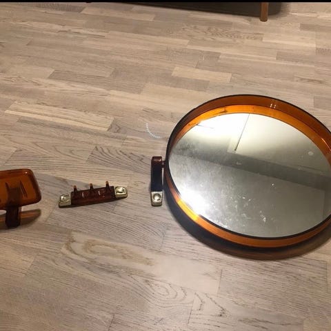 Kult vintage speil pluss to knaggrekker fra Franske Grosfillex. Knaggrekkene er i 2 + 3 knagger. Et par av messingtuppene er litt løse, men ikke noe å si på bruken.