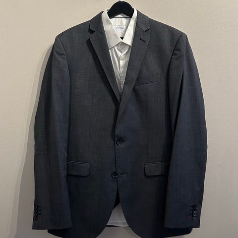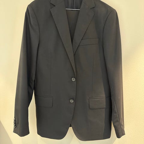 Jakken er gråsort, buksen stripete blå og hvit skjorte.