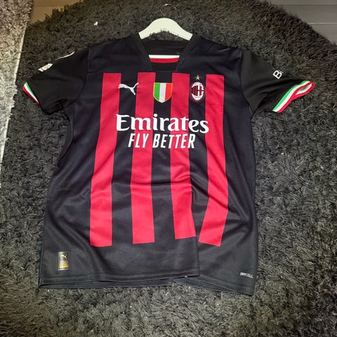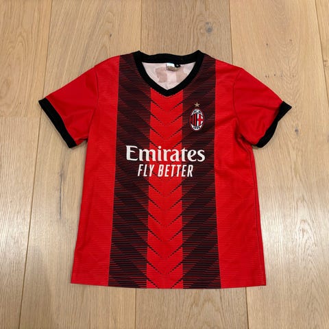 Puma AC Milan fotballdrakt for herre i størrelse L. Kortermet drakt i rød og svart med klubbemblem på brystet og sponsorlogo foran. Egnet til fotballspill, trening eller som supportereffekter. Laget i teknisk materiale som transporterer fuktighet bort fra kroppen under aktivitet.