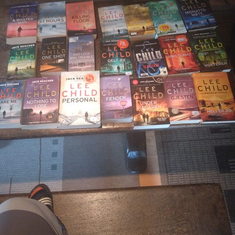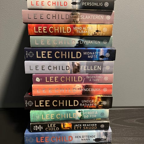 Har 30 bøker av Lee Child med hovedpersonen Jack Reacher som jeg selger samlet for 1000,-+ frakt. Pakken veier 9,7 kg. Se gjerne de andre annonsene på profilen min.