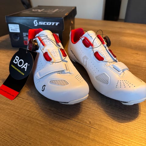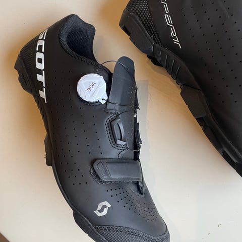 Scott sykkelsko for terrengsykling i størrelse 43. Skoene er svarte og har BOA-stramming kombinert med borrelåsrem for justerbar passform. Undersålen er tilpasset klikkpedaler med to-boltsfeste (SPD-type), som vist på bildet. Overdelen har perforeringer for ventilasjon. Egner seg til terrengsykling, pendling eller annen bruk med kompatible klikkpedaler.