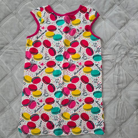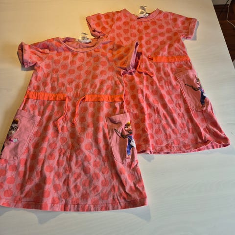 Hjemmelaget kjole til 2-3 åring i polyester bomullsblanding med strikk som skulderstropper. Hentes i Skudeneshavn eller sendes med fiks ferdig.